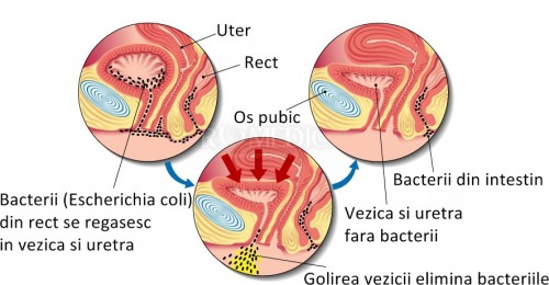 - Se recomandă consumul crescut de lichide (apă, ceaiuri, sucuri) pentru stimularea diurezei È™i împiedicarea aderării germenilor pe suprafaÈ›a pereÈ›ilor vezicii urinare.