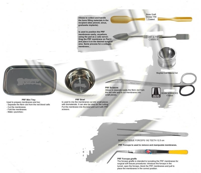 | PRF Bowl PRF Mini Tray PRF DEAN SCISSORS S-Shaped - One Blade Serrated PRF Forceps PRF Forceps giraffe PRF Bone Graft Scoop-TiNi Coated PRF Pad Weighted graft material dish |