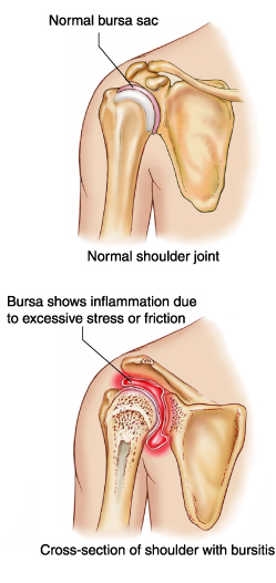 Bursa subacromiala se afla intre acromiom si capa rotatorilor. Bursita subacromiala este asociata cu tendonita supraspinata datorita extinderii inflamatiei de la o structura la cealalta. Activitatile repetitive cu bratul ridicat determina inflamatia bursei. Activitalile incriminate sunt jocul de baseball si intinderile atirnat de miini. Mai rar, un proces primar precum artrita reumatoida, guta sau tuberculoza pot conduce la bursita.Bursita olecraniana