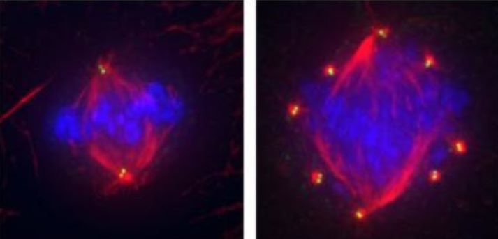 Se poate observa în imagine că celulele sănătoase, cele din stânga, au 4 centrioli, cum e normal (punctele galbene), iar în celulele canceroase mamare (triplu negativ) sunt mai mulți centrioli, în acest caz 16, cum se vede în imaginea din dreapta.