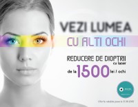 "Vezi viata fara ochelari", campanie initiata de clinica noastra la inceputul lunii decembrie 2014, a fost prelungita pana la sfarsitul lunii august 2015! Campania presupune acordarea unui DISCOUNT de 50% tuturor pacientilor care doresc sa scape de dependenta de ochelari si lentile de contact printr-o operatie de reducere de dioptrii cu laser - LASIK sau PRK. Astfel, in prezent, pretul unei operatii variaza intre 1500 si 1750 de lei/ochi in loc de 3000 si 3500 lei/ochi.