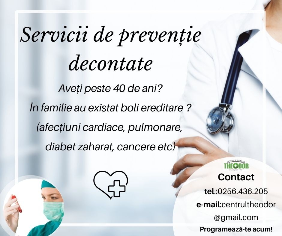 •Servicii de prevenție decontatePrevenția este importantă indiferent de vârstă pentru a putea evita îmbolnăvirile ori a se afla de diferite afecțiuni încă dintr-o fază incipientă.
