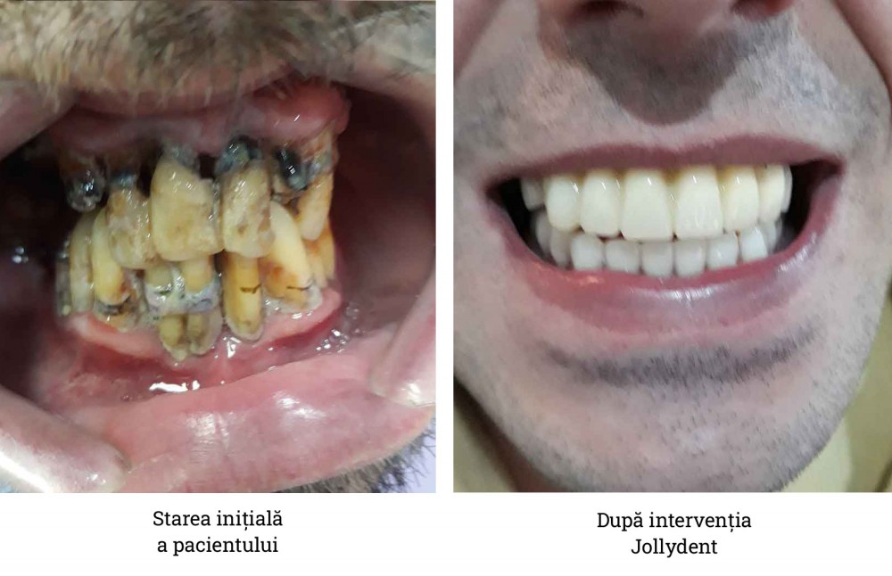 Din istoricul pacientului am aflat că a mai încercat să își trateze dinții dar nu a găsit empatia de care avea nevoie. Își dorea un medic care să aibă răbdare să îl asculte, să îl înțeleagă și să nu îl judece pentru situația jalnică în care se aflau dinții lui. La Jollydent veți găsi mereu o echipă primitoare, empatică, foarte bine pregătită din punct de vedere profesional și înarmată cu multă răbdare.