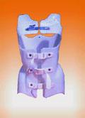 Corsetul este executat din plastic termoformabil pe baza mulajului individual. Fixarea se face cu ajutorul unor benzi cu catarame.