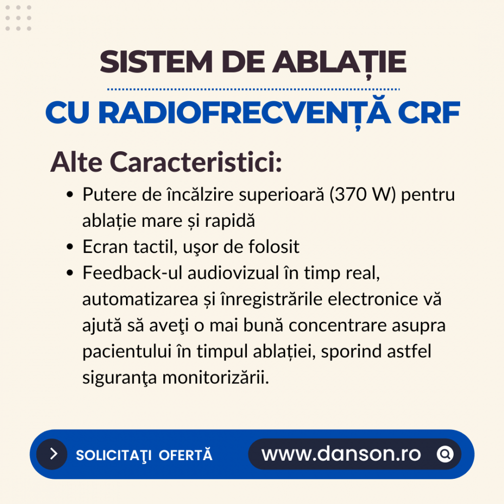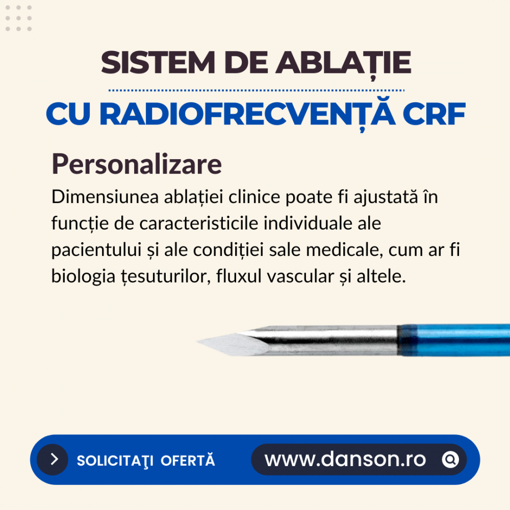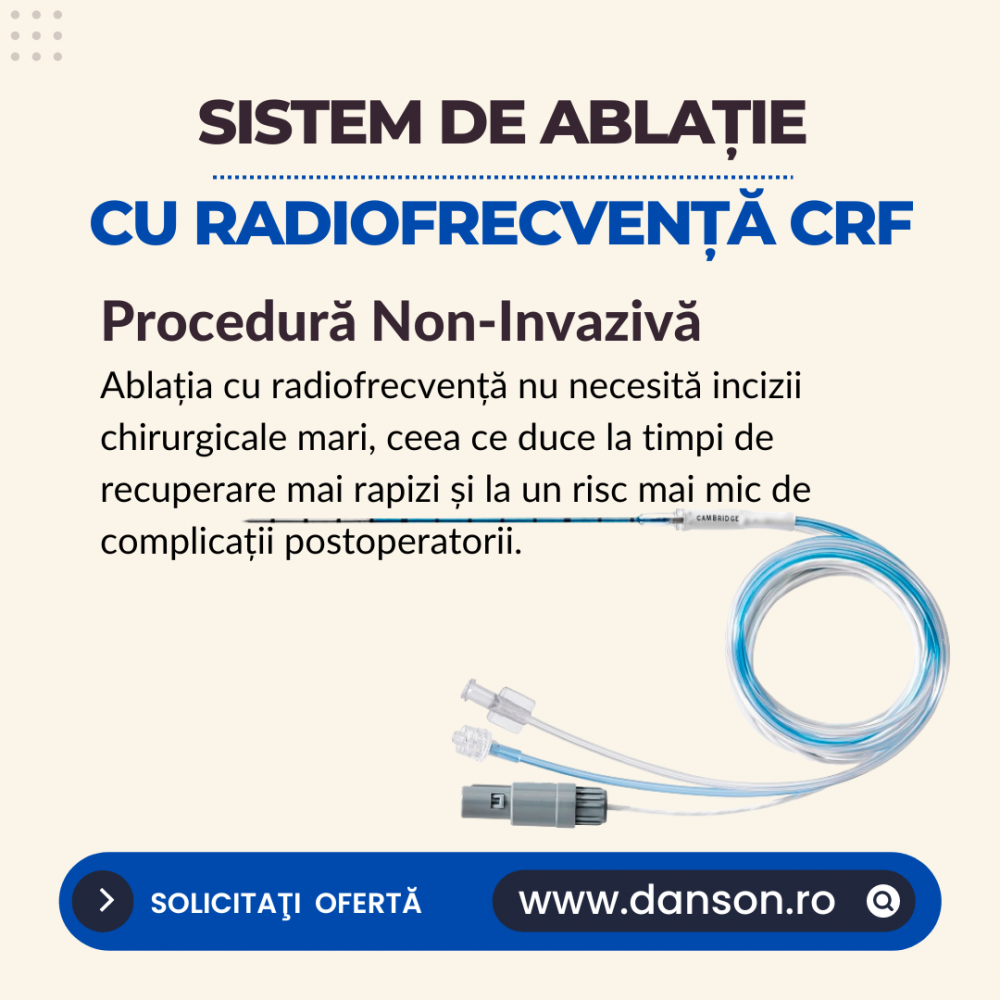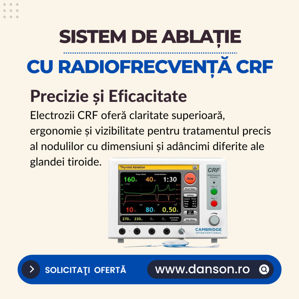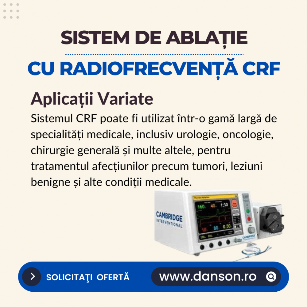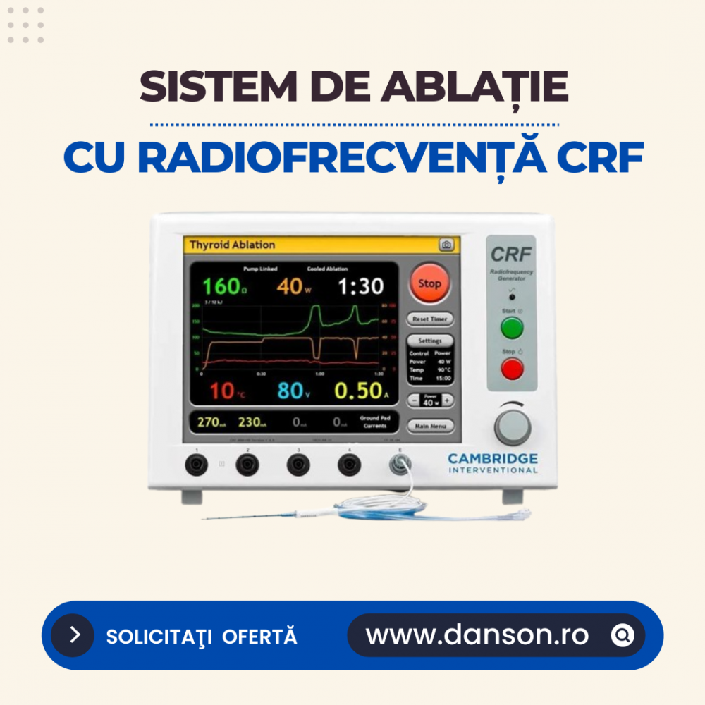 - Sistemul de ablație cu radiofrecvență CRF de la Cambridge Interventional, furnizat de Danson, reprezintă o soluție inovatoare și eficientă pentru proceduri minim invazive. Prin electrozii săi avansați și generatoarele cu funcții automatizate, acest sistem îmbunătățește rezultatele clinice și siguranța pacientului. Fiabilitatea și precizia sa fac din CRF o opțiune ideală pentru medicii care doresc să trateze o gamă largă de afecțiuni cu tehnici de ablație minim invazive.