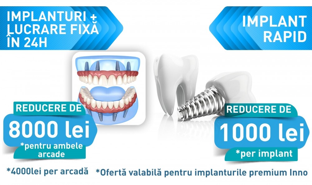 Indiferent daca ai pierdut unul sau mai multi dinti, implantul dentar poate fi solutia optima de restaurare a danturii. Este o procedura sigura si eficienta, efectuata de catre specialistii in implantologie dentara. In plus, tehnologia avansata utilizata in prezent asigura o experienta confortabila si minim invaziva.
