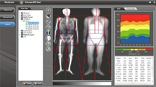 Zone scanate: coloană vertebrală, femur (stânga/dreapta), antebraţ, coloană din lateral, întregul corp