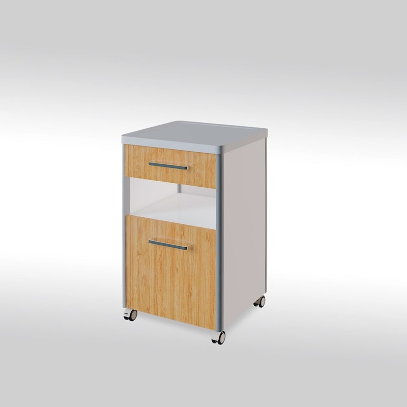 BEDSIDE-06 este noptiera medicală definitivă, concepută pentru a oferi tot suportul necesar unui pacient fără a mai fi nevoie de alte piese de mobilier auxiliare. Realizată din lemn laminat de înaltă densitate, aceasta combină estetica primitoare a mobilierului de casă cu versatilitatea cerută de protocoalele medicale moderne: