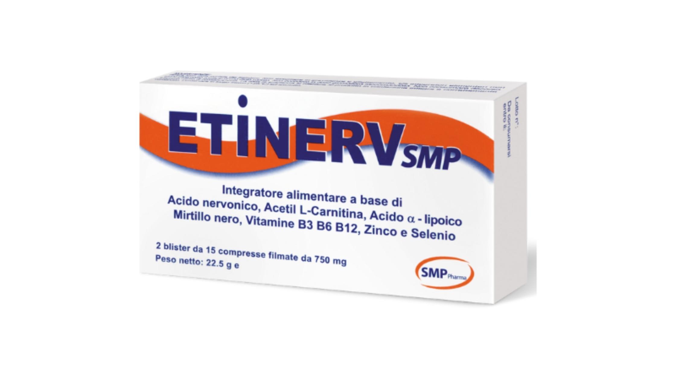 Etinerv are in compozitie o combinatie de nutrienti si ingrediente naturale care actioneaza impreuna pentru a proteja si reface tesuturile in cauza. Printre cele mai importante ingrediente active se numara acidul alfa-lipoic (300mg/comprimat) si acidul nervonic (50mg/comprimat).