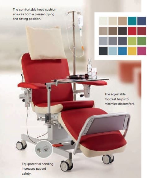Fotoliul Basic Line2 a fost special conceput pentru a satisface nevoile centrelor de tratamente ambulatorii, dializă, oncologie, donare de sânge și plasmă. Acopera toate tipurile practici clinice.