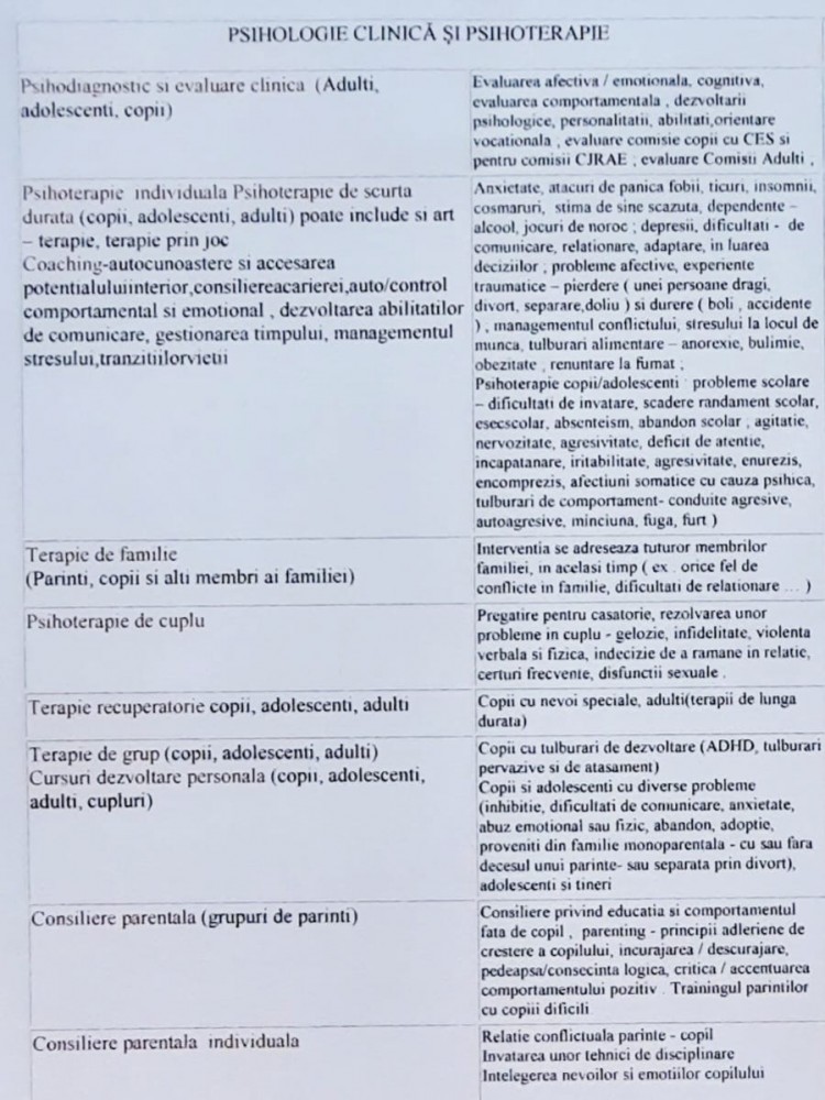 - Evaluări psihologice individuale, dar și pentru comisii: Comisia de copii cu CES, pentru Comisia pentru orientare școlară CJRAE, Comisia pentru adulți (pensionare pe caz de boala);
