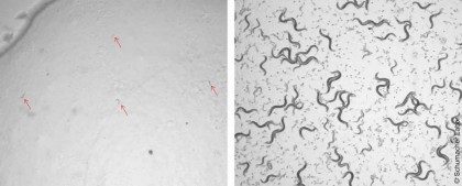 foto: Imagine microscopică a C. elegans la 10 zile după tratamentul cu raze UV-B. Stânga: Viermii cu complexul DREAM intact nu pot repara bine ADN-ul. Dreapta: Viermii fără complex DREAM repar daunele și trăiesc mai mult. University of Cologne