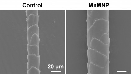 foto: Părul a redevenit mai gros la șoarecii tratați cu un plasture cu microace de mangan-nanozimă (imagine din partea dreaptă, etichetată MnMNP) în comparație cu cei tratați cu testosteron ca martor (imagine din partea stângă).