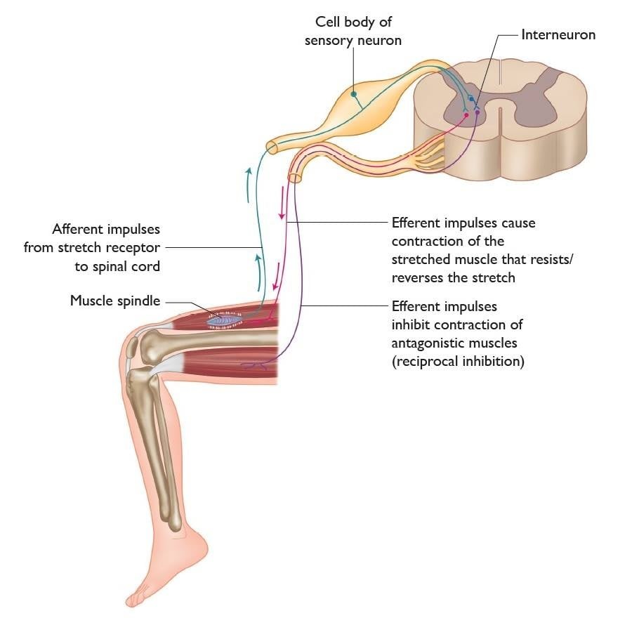 - muşchii hipotoni (agoniştii) se întind progresiv în timpul contracţiei antagonistului, şi ca urmare, la finalul mişcării (când sunt maxim întinşi) vor fi facilitaţi prin impulsuri provenite de la nivelul fusului muscular (de la receptorul secundar Ruffini).