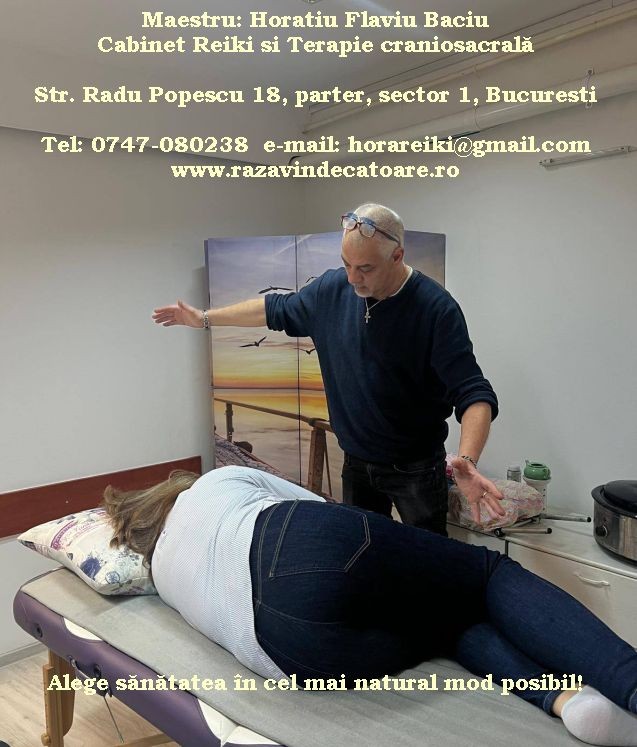 Când apar restricții în diferite zone ale fasciei sau în dinamica lichidului cerebro-spinal, atunci apar și suferințele de la nivel fizic și/sau mental-emoțional. În principiu, când facem terapie cu raze energetice vindecătoare, eliminăm aceste restricții din corp, printr-o foarte fină manipulare a țesutului, a coloanei vertebrale, a musculaturii și viscerelor (organele din cavitatea abdominală). Apoi, prin pase energetice specifice, realizăm ceea ce numim RESTART al corpului, minții și sufletului, astfel încât structurile anatomice să-și poată relua în condiții optime funcțiile pentru care au fost create! Oferă-ți și tu un tratament de relaxare și RESTART cu tehnica energetică a razei vindecătoare și vei experimenta starea de grație a unei ființe conectate la perfecțiunea universală! Te pot ajuta să-ți vindeci durerile de cap, gât, membre, coloană vertebrală, oase, mușchi și articulații și să trăiești fără restricții! Te pot ajuta să treci cu bine peste stările de angoasă, anxietate și depresie. Te aștept cu drag la cabinetul meu din București (programare la tel: 0747-080238). Dacă nu ai timp pentru un tratament în București, atunci poți comanda cartea ”Raza vindecătoare” pe www.razavindecatoare.ro. Str. Radu Popescu, nr. 18, parter, ap. 2, sector 1, București.