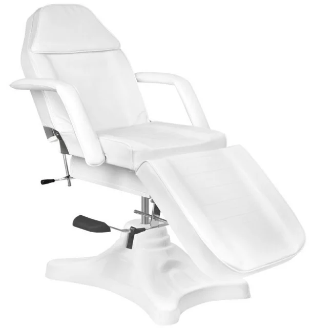 cu orificiu in tetiera, perfect pentru cosmetica, machiaj si masaj. Are cotiere detașabile și priză în tetiera. Husa fotoliului este usor lavabila, din piele ecologica, indeplineste cerintele stricte ale UE, elemente estetice din metal nichelat. Sub fotoliu se montează o fundă pentru un cearșaf de unică folosință, fețe de masă sau un prosop..