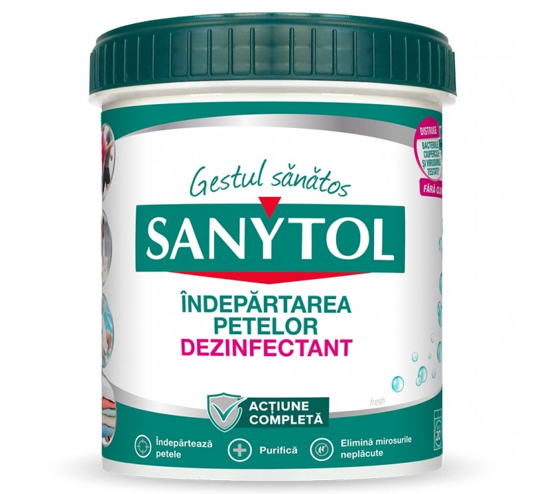 - Sanytol Indepartarea Petelor Dezinfectant Actiune Completa este special conceput pentru a asigura o igiena completa a rufelor spalate la temperaturi scazute. Formula sa fara clor elimina microbii, mirosurile neplacute si petele dificile incepand de la 30 de grade Celsius. Imbogatita cu enzime, patrunde adanc in fibrele textile si actioneaza eficient pentru a reda curatenia si prospetimea hainelor.