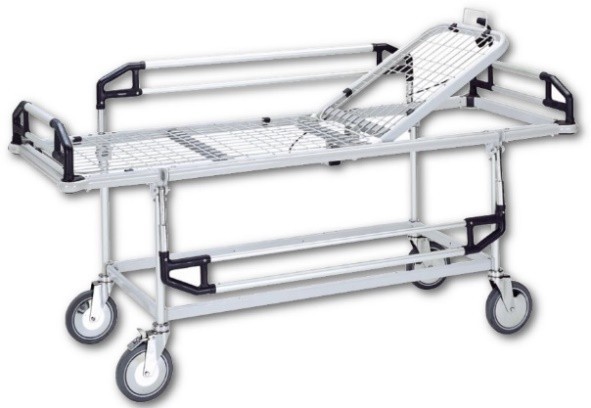 Targă mobilă pe roți, cu saltea ignifugă și secțiune reglabilă pentru pacient.