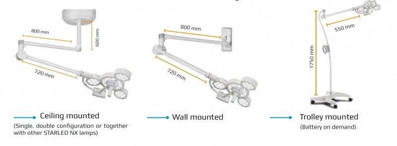 STARLED 3 NX este o lampa pentru mici interventii chirurgicale, fiind varianta imbunatatita a STARLED 3 EVO PLUS. A fost imbunatatit atat designul cat si caracteristicile tehnice: are o putere mai mare de iluminare ajungand pana la 130.000 lx, temperatura culorii fiind de 4.500° K si indicele de redare al culorii de 95 rezultand o iluminare excelenta. Focalizarea asupra campului iluminat se face printr-o simpla rotire a manerului (in sensul acelor de ceasornic si invers).Vizualizări produs: 1918