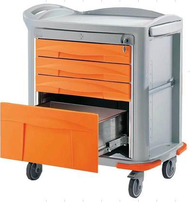 Troliu pentru medicatie tip monobloc, fabricat din polyethilen liniar pigmentat, usor de curatat si dezinfectat. Este predispus cu laterale anti-cadere pe marginea topului de lucru, colturi si margini rotunjite si maner ergonomic pentru impingere.