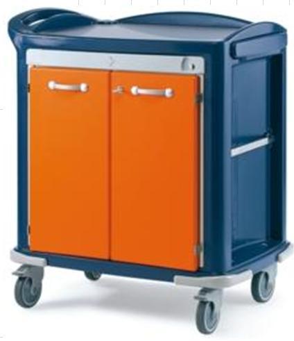 Troliu pentru medicatie tip monobloc, fabricat din polyethilen liniar pigmentat, usor de curatat si dezinfectat. Este prevazut cu laterale anti-cadere pe marginea topului de lucru, colturi si margini rotunjite si maner ergonomic pentru impingere.