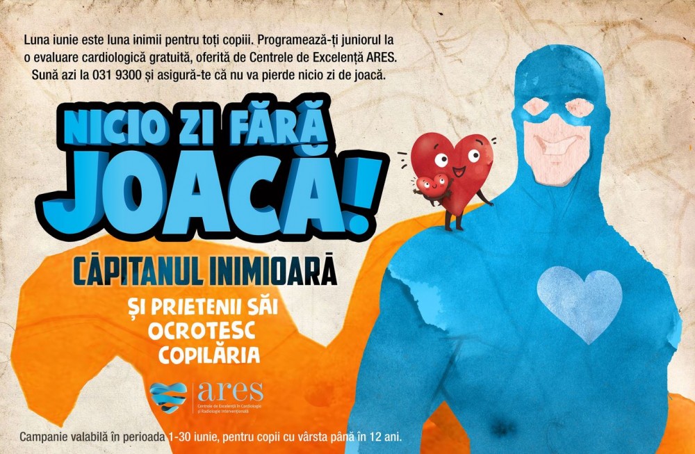 Luna iunie este luna inimii pentru copii. Programul de screening cardiac "Nicio zi fără joacă", lansat în 2015 de Centrele de Excelență ARES, revine și anul acesta cu electrocardiograme gratuite pentru copiii sub 12 ani. Medicii vor oferi consultații gratuite și vor interpreta electrocardiogramele micilor pacienți. Totul într-o atmosferă de sărbătoare în care copiii vor face poze cu Căpitanul Inimioară – supereroul care are grijă de sănătatea lor, vor colora și se vor juca. Consultațiile vor avea loc la sediul Centrelor de Excelență ARES, din strada Tony Bulandra numărul 27, sectorul 2, în baza programărilor la numărul de telefon 031 9300. În funcție de numărul solicitărilor, programul se poate prelungi și pe durata lunii iulie