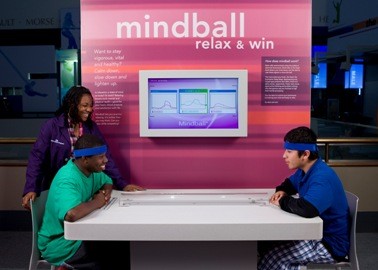 Jocul MINDBALL se desfăşoară la o masă specială pe care se află o bilă ce trebuie mişcată şi condusă către terenul de ţintă al adversarului numai prin puterea creierului.