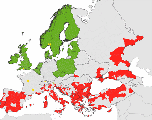 Prevalența speciei Ixodes ricinus în Europa în ianuarie 2016