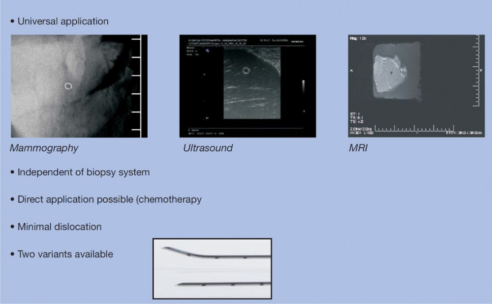 -Servește pentru marcarea percutană în țesutul – tumora mamara. Printre altele, markerul este implantat în leziuni înainte sau în timpul chimioterapiei cu scopul de localizare a unui punct din care s-a prelevat biopsia, COMPATIBIL CU RMN