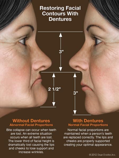 Odată cu trecerea anilor, uzura(abrazia) fiziologică si/sau patologică a dinților frontali si laterali precum si absența dinților în zonele laterale duc la modificarea expresiei faciale si modificarea etajului inferior al feței.Chipul pare astfel îmbătrânit : șanțurile nasolabiale si labiomentonier accentuate, colțurile buzelor căzute, obraji supți, pometi prabușiți.