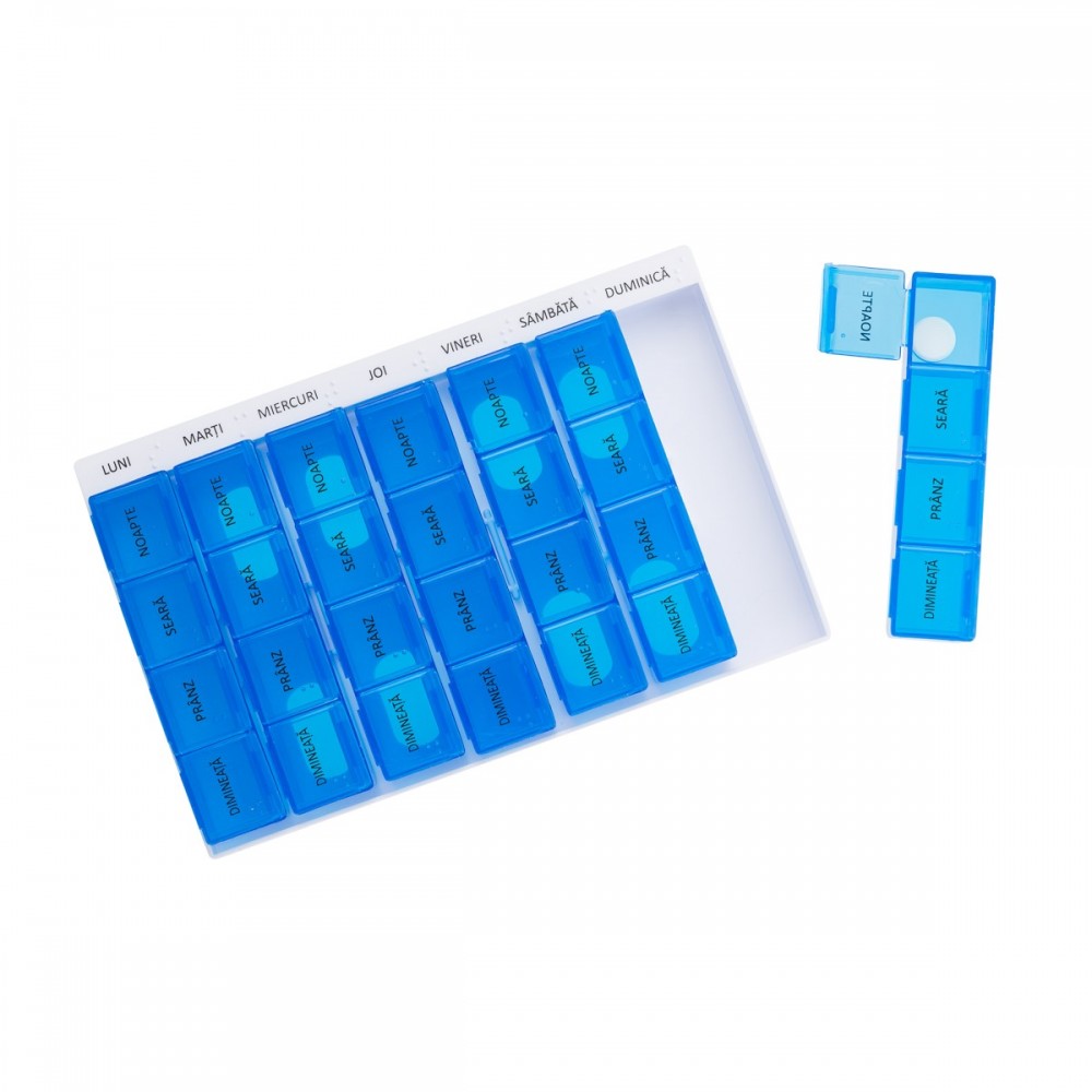 Este compus din 7 compartimente detasabile, unul pentru fiecare zi a saptamanii, prevazute cu casete separate pentru fiecare interval din zi (dimineata, pranz, seara, noapte).