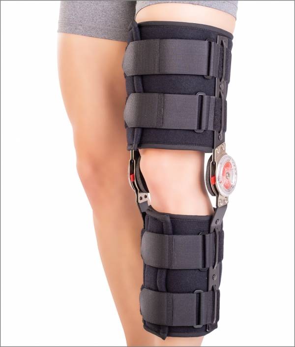 DESCRIERE Orteză post-operator ațele laterale din aluminiu și articulație policentrică la nivelul articulatiei genunchiului, care permite ajustarea felxiei și extensiei în trepte de 10 și 15 grade. Închiderea se realizează prin sistem velcro.