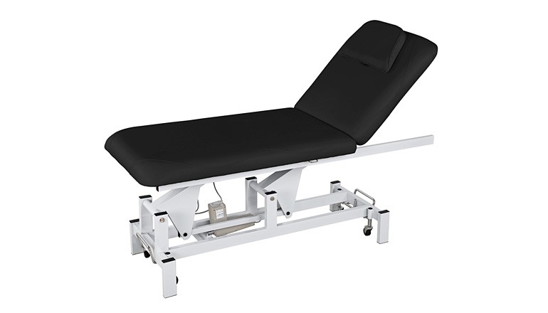Masa cu 2 sectiuni cu structura metalica foarte stabila. Echipat cu 1 motor care controleaza inaltimea mesei printr-un buton lateral incorporat in structura. Spătar reglabil prin ridicare cu gaz. Pernă detașabilă pentru tetiera cu orificiu de aerisire. Roți retractabile pentru a facilita mobilitatea acestuia. Tapițerie albă din PU de înaltă calitate care ușurează curățarea. Suport role de hârtie inclus.