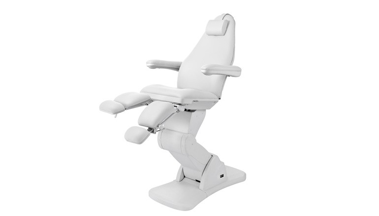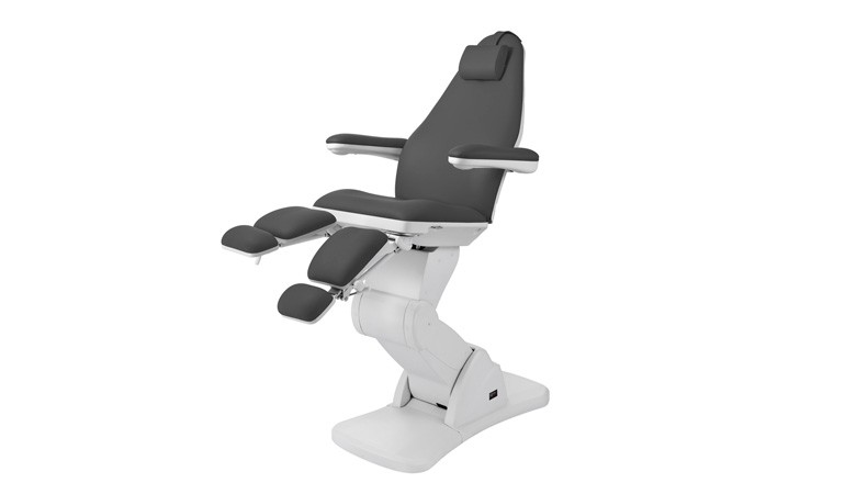 Scaun de podologie de lux echipat cu 3 motoare care controlează înălțimea, înclinarea spătarului și a scaunului.