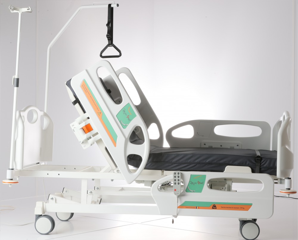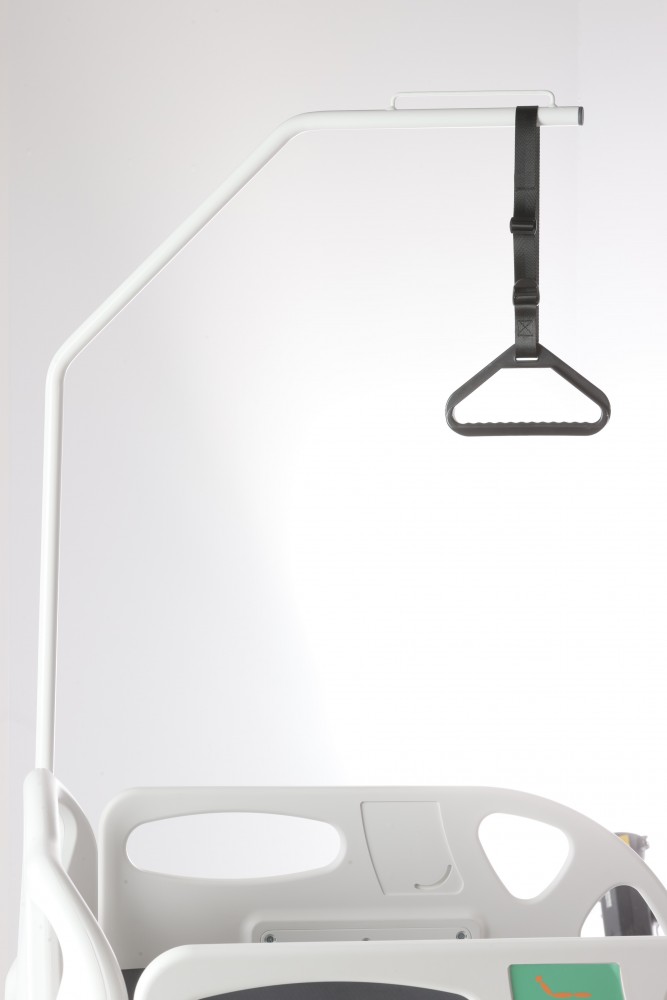 - Brațul de prindere a suportului de ridicare pacient se poate piziționa pe toată lungimea bării suport a tăbliei de la cap, iar în acest suport se pot pune atât suportul de ridicare pacient, cât și bară suport pentru accesorii (infuzomat, injectomat, monitor funcții vitale).
