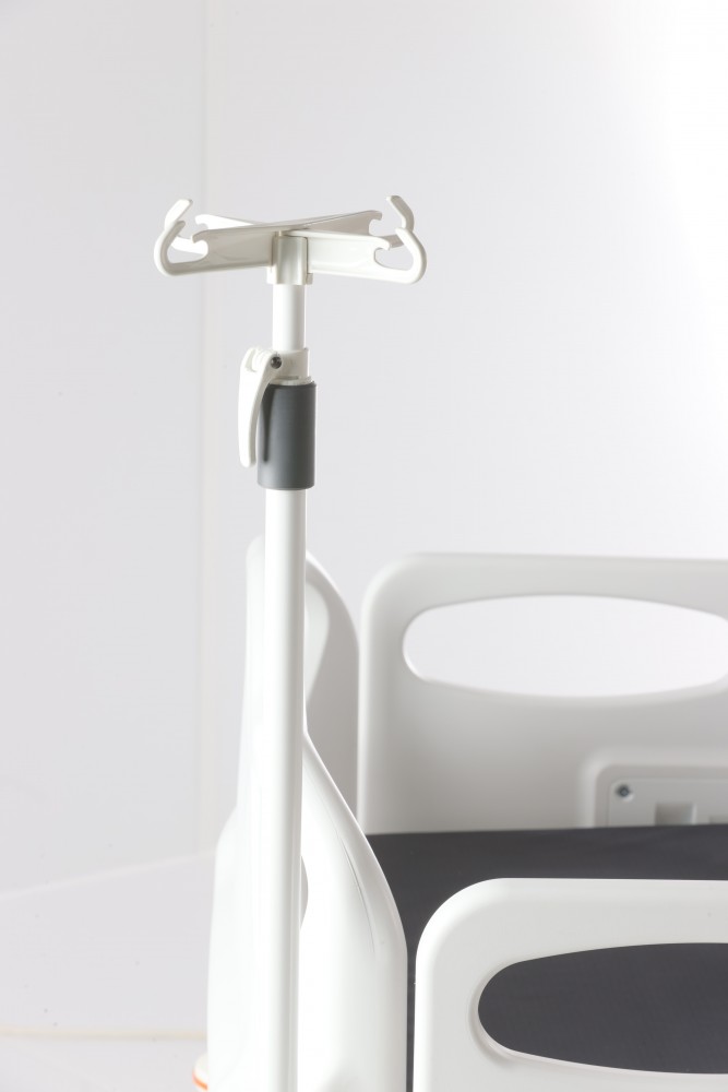 - Suport perfuzie reglabil pe înălțime in intervalul 800-1400mm, cu 4 cârlige, ce poate fi poziționat în oricare din cele 4 colțuri ale patului.