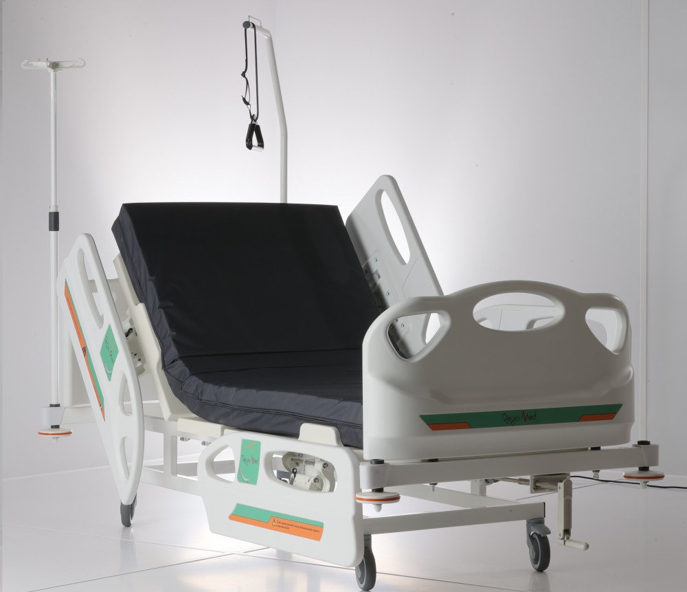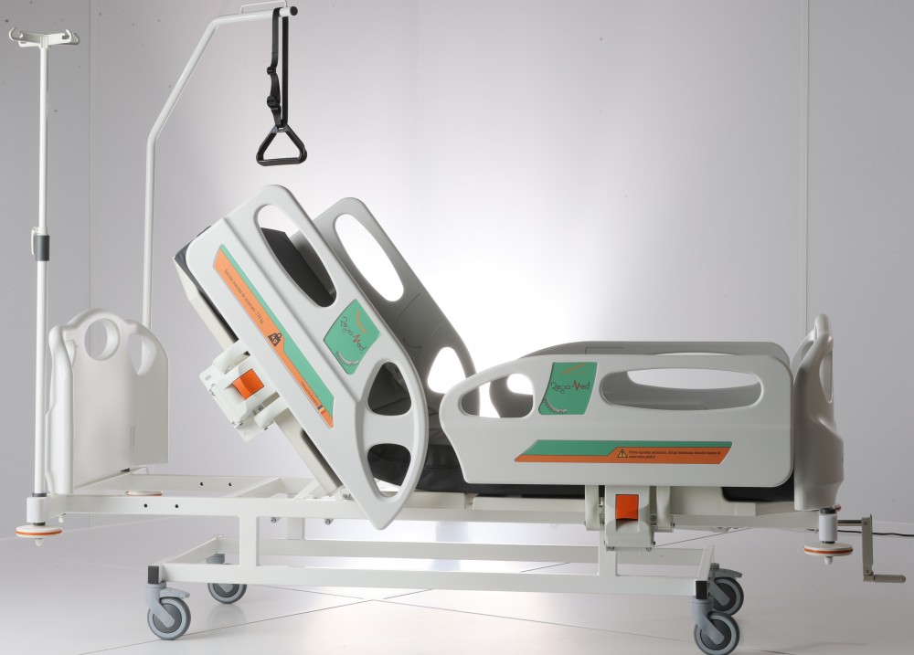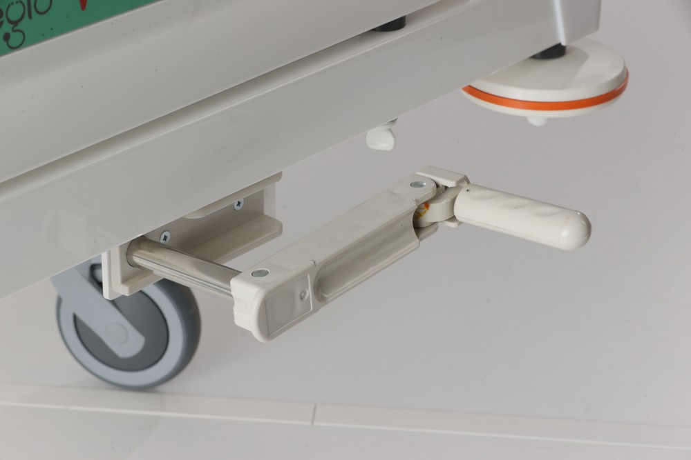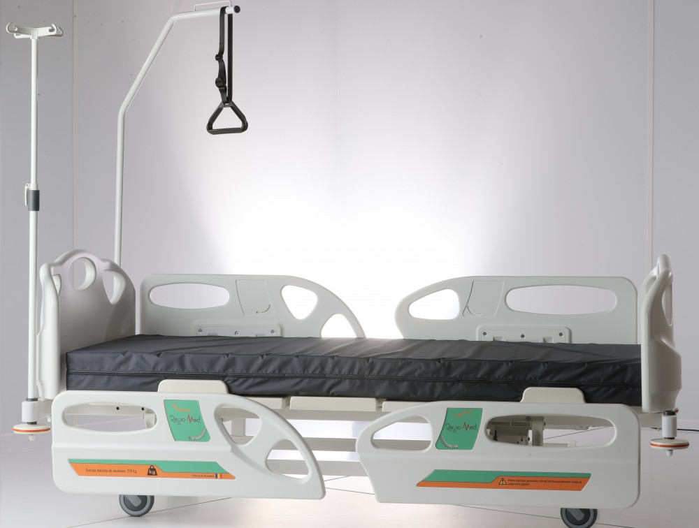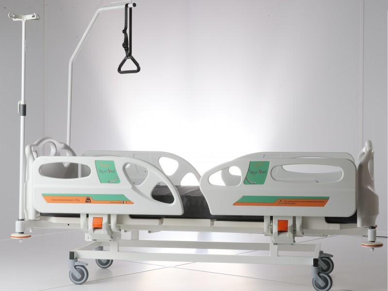 - Brațul de prindere a suportului de ridicare pacient se poate piziționa pe toată lungimea bării suport a tăbliei de la cap, iar în acest suport se pot pune atât suportul de ridicare pacient, cât și bară suport pentru accesorii (infuzomat, injectomat, monitor funcții vitale).