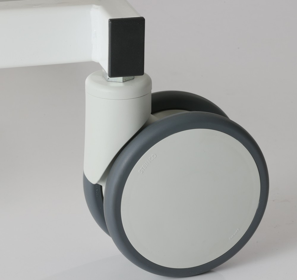 - Roți duble cu diametrul de 150mm, două cu frână individuală, două fără frână sau roti simple (optional)