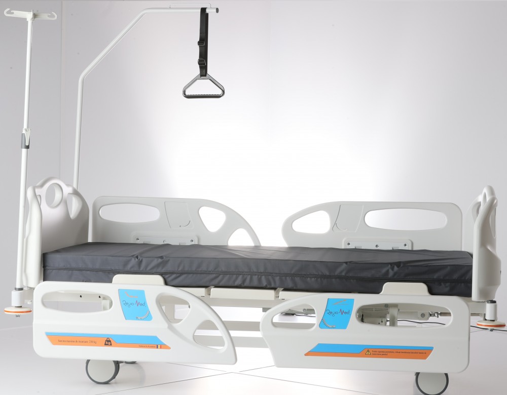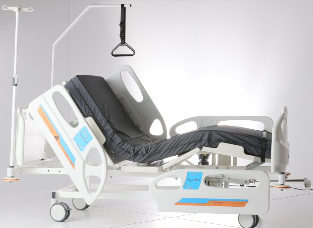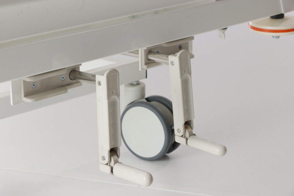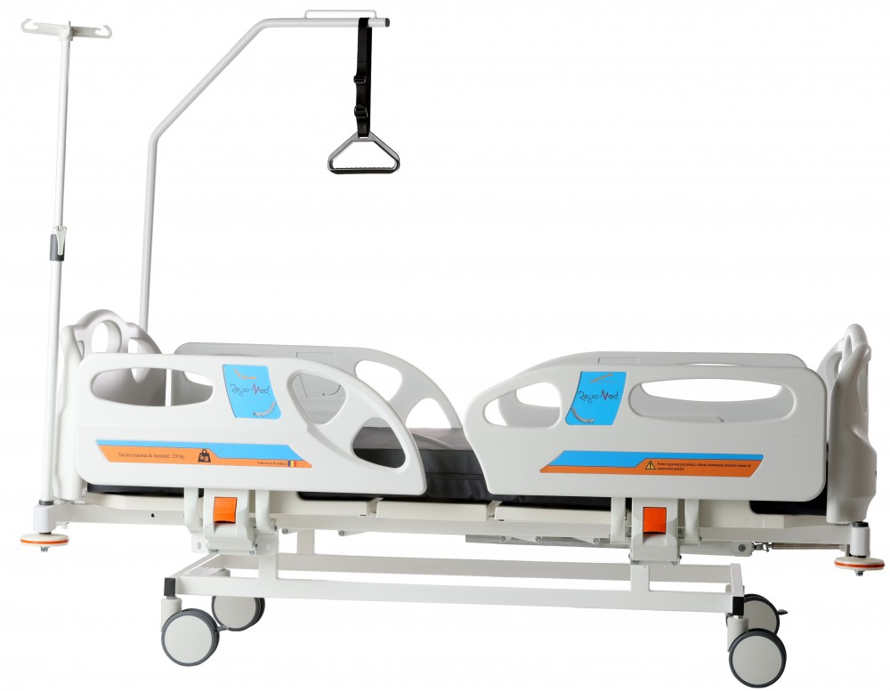 - Brațul de prindere a suportului de ridicare pacient se poate piziționa pe toată lungimea bării suport a tăbliei de la cap, iar în acest suport se pot pune atât suportul de ridicare pacient, cât și bară suport pentru accesorii (infuzomat, injectomat, monitor funcții vitale).