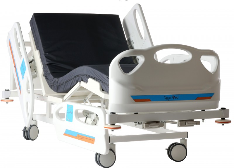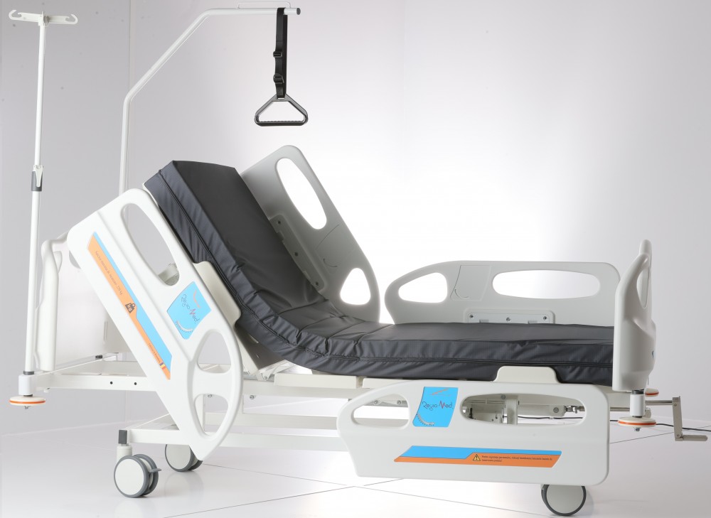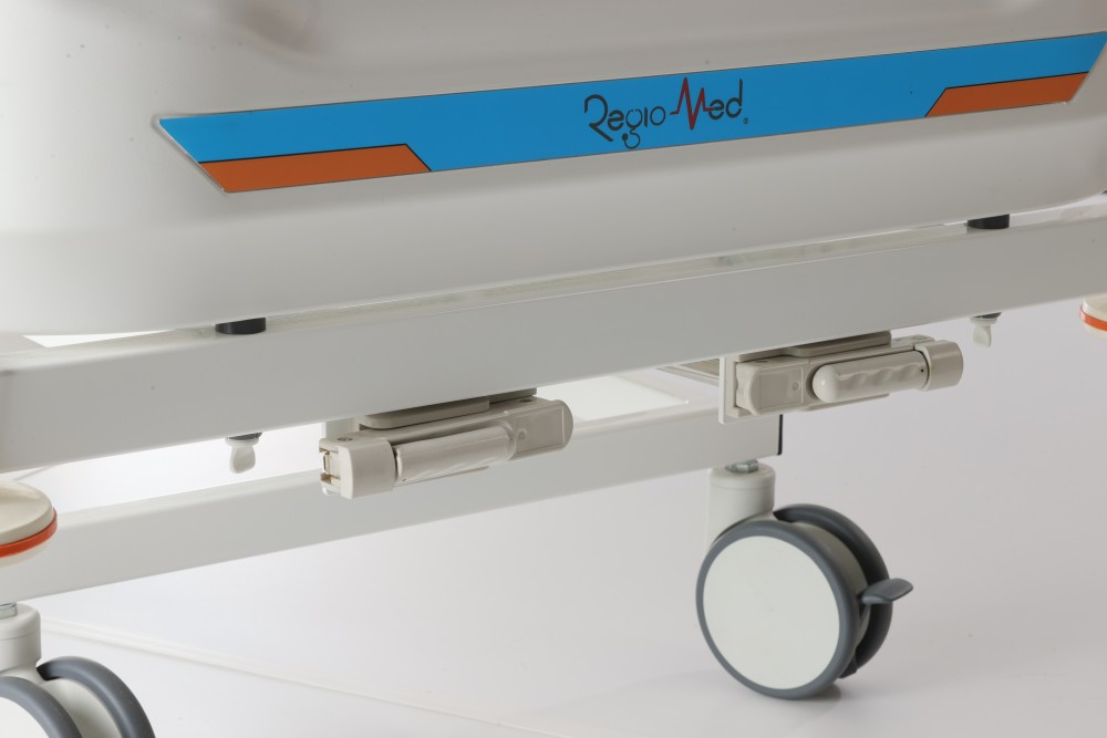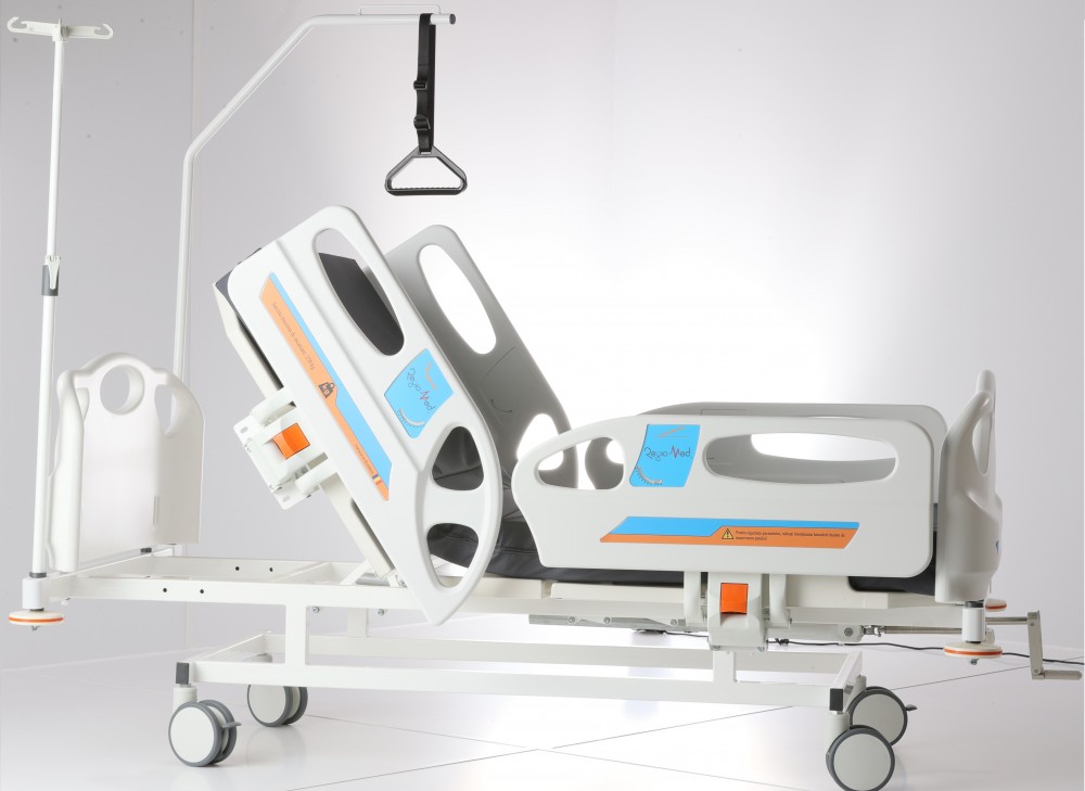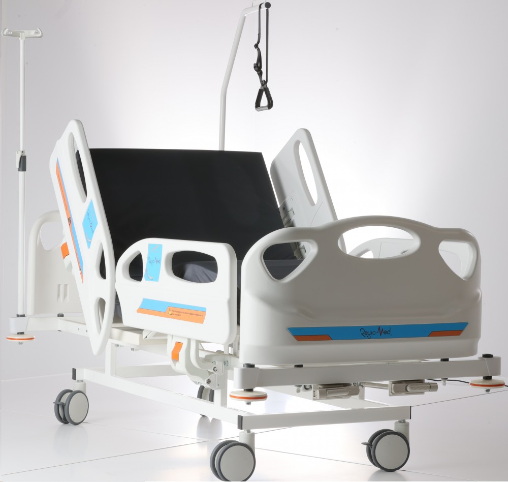 - Brațul de prindere a suportului de ridicare pacient se poate piziționa pe toată lungimea bării suport a tăbliei de la cap, iar în acest suport se pot pune atât suportul de ridicare pacient, cât și bară suport pentru accesorii (infuzomat, injectomat, monitor funcții vitale).