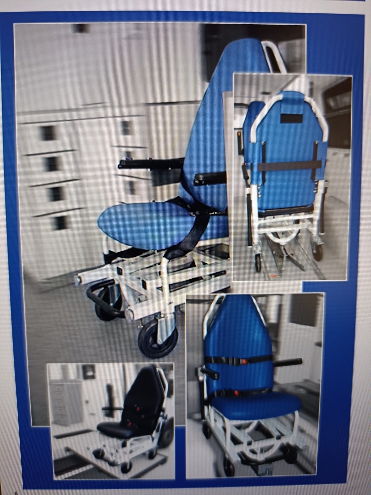 Scaun cu rotile de transport pacienți pentru ambulanță, cu sistem de prindere în podea. Nou, pe comandă. Compatibile cu sistemul de prindere în podea cu șină.