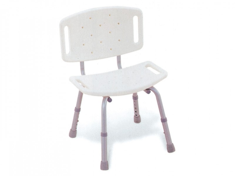 Scaun pentru dus, cu cadru din aluminiu si spatar si sezut din plastic.