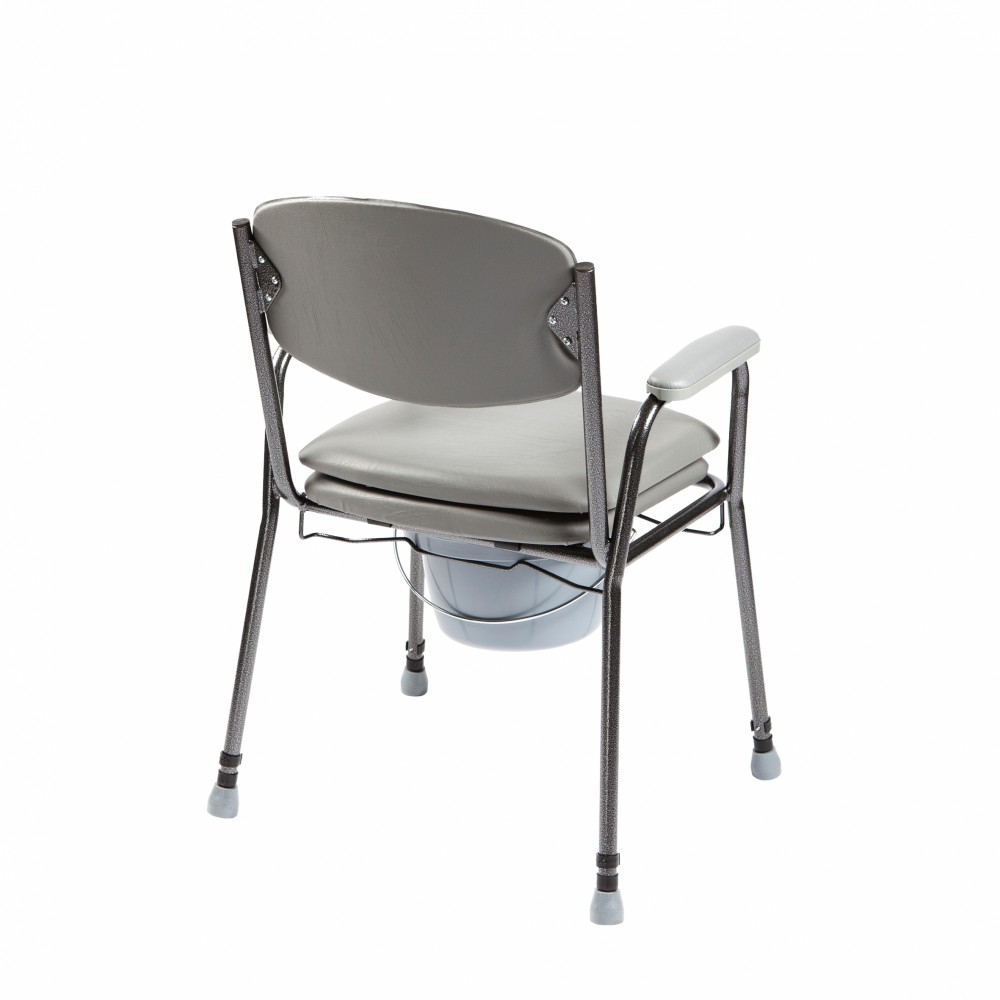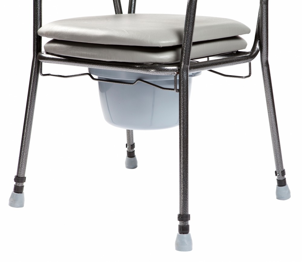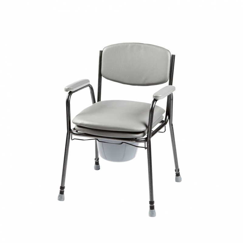 Acest scaun cu WC portabil are o structura metalica rezistenta, cu greutate proprie de 7 kg si capacitate maxima 130 kg. Sezutul si spatarul sunt captusite, concepute pentru a oferi confort ridicat in utilizare. Sub sezut se afla un recipient de 5 litri, usor de scos si curatat. Capacul captusit asigura discretie si poate transforma scaunul intr-un fotoliu moale si comod atunci cand nu este folosit ca toaleta.