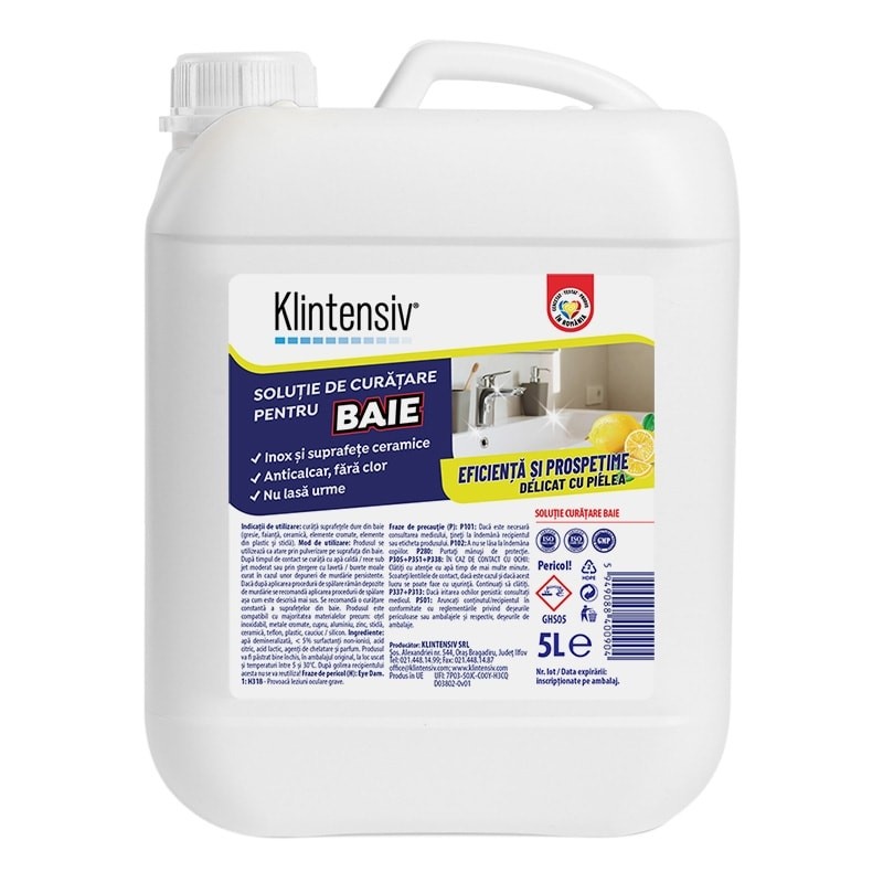 - Klintensiv – Solutie Curatare Baie este conceput pentru indepartarea eficienta a depunerilor de calcar si a murdariei