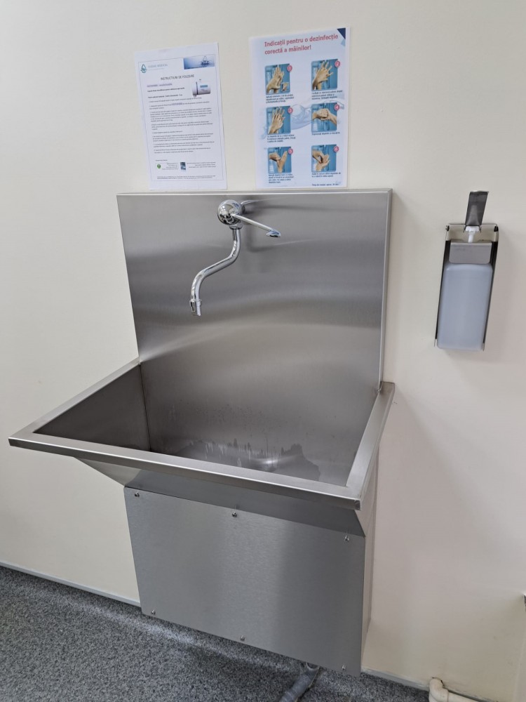 Spalator chirurgical pentru spalarea mainilor cu montare pe perete, din inox AISI 304; suprafata cu finisaj lucios (tip oglinda), cu grosimea materialului de 1,5 mm, fara scurgere de preaplin.