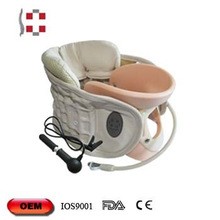 In momentul umflarii partea de jos apasa pe umeri iar partea de sus impinge barbia si ceafa astfel creeaza decompresie cervicala. Puteti ajusta presiunea cu ajutorul pompei care se poate detasa dupa umflare.