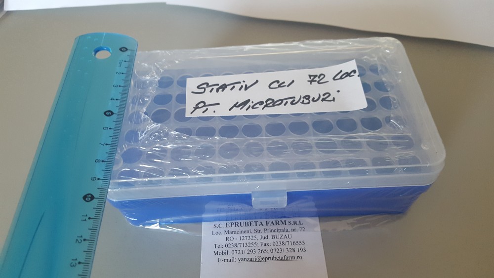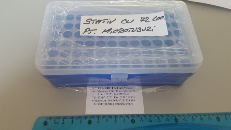 STATIVE PENTRU DEPOZITAREA MICROTUBURILOR ŞI CRIOTUBURILOR, CU CAPAC ATAŞAT - cu 72 de locuri - Pot fi utilizate pentru microtuburi de 1,5/2,0 ml sau criotuburi standard de 1,2 ml. Stativele pot fi depozitate la temperaturi scazute pâna la -90oC.CONDITII MINIME DE LIVRARE: