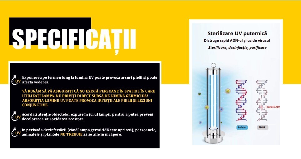 În perioada dezinfectării (când lampa germicidă este aprinsă), persoanele, animalele și plantele să NU se afle în încăpere.