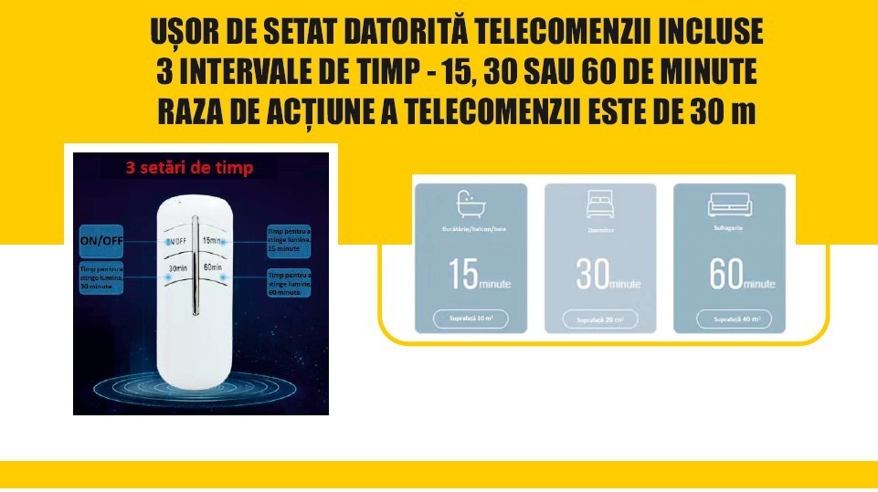 UȘOR DE SETAT DATORITĂ TELECOMENZII INCLUSE 3 INTERVALE DE TIMP - 15, 30 SAU 60 DE MINUTE RAZA DE ACȚIUNE A TELECOMENZII ESTE DE 30 m