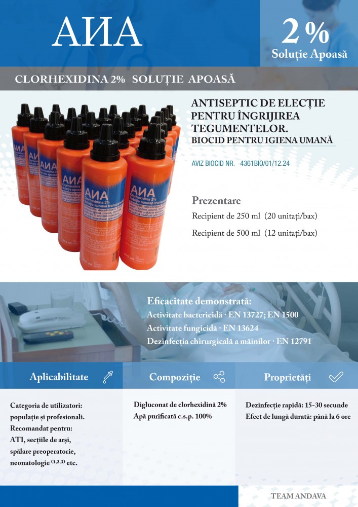 "Îmbăierea zilnică cu Clohexidina 2% soluție apoasă a pacienților copii și adulți aflați la terapie intensivă a arătat o reducere semnificativă a infecțiilor nosocomiale." (1)